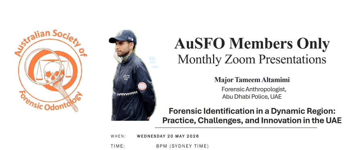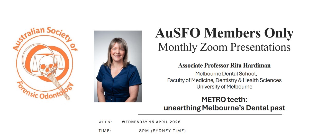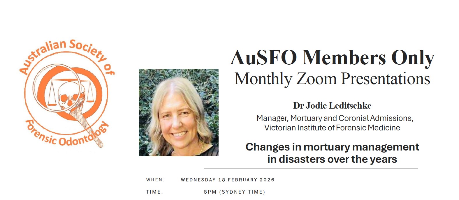 AuSFO is a society open to any dental professional of good standing with an interest in forensic odontology. It has no legislative or administrative function, but aims to represent forensic odontologists in their interactions with stakeholders. In this context it is the overarching body facilitating the involvement of member forensic odontologists in DVI, both nationally and internationally.
